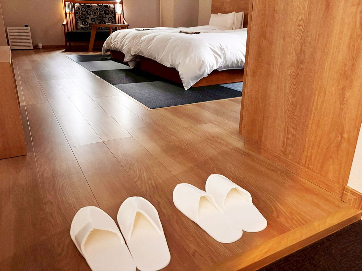 実際に館内を見て回る中で、このスリッパが客室の空間や日常の動線の中に、ごく自然に馴染んでいるように感じました。